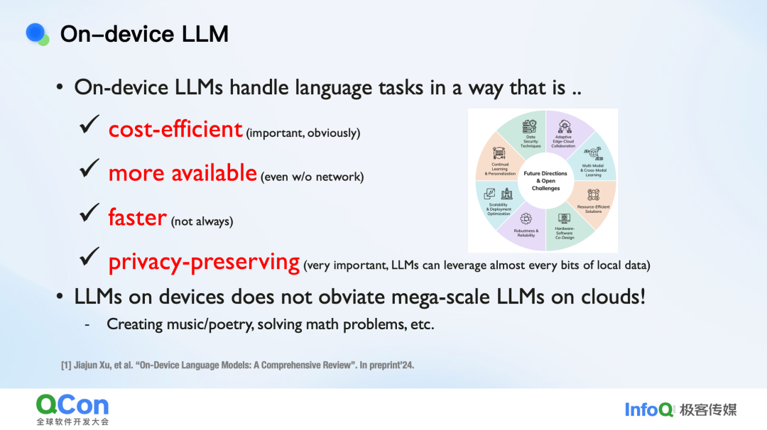 从效率角度看,我觉得很有意思的一点是:一旦大模型变成系统级服务,就跟在云端一样,得考虑怎么调度、怎么缓存复用、怎么做 batch。以前端侧几乎只考虑 batch size 等于 1 的场景,可将来如果大模型无处不在,不光喊“Hi Siri”时才触发,后台也可能一直跑,主动感知、主动推荐。到那时,它得同时处理很多请求,就跟云上一模一样。