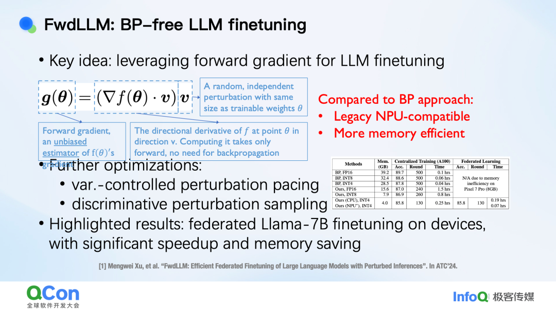 我们不仅想用 NPU 做推理,还想用它做大模型的微调训练。和小米合作的项目就是端侧大模型微调。要解决的问题是 NPU 本身不支持反向传播。我们用了一些算法层面的技巧,主要是临界优化,把推理和训练并到一条前向通路里,只需前向就能算出 loss 并更新参数。虽然端到端性能一般,但确实在端侧跑通了 7B 模型的微调。