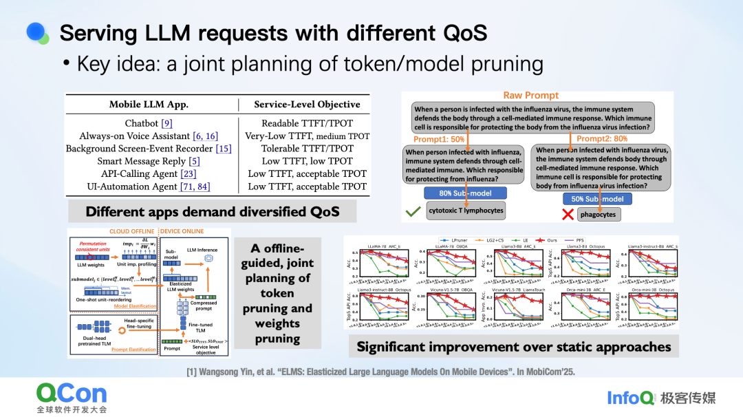 我们做过一个实验:怎样让大模型提供弹性服务。有的应用希望 prefill 快,有的希望 decode 快,有的对延迟不敏感,只想要生成质量高。于是我们把 token-level 的剪枝和模型 -level 的剪枝结合起来,在保障 QoS 的前提下,尽量把生成质量做到最好。