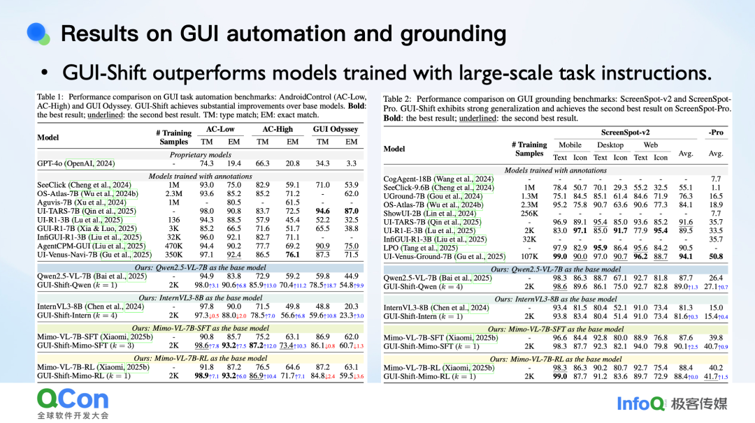 我们用这套方法收集数据,训了最大 7B 的模型;卡不够后,又与小米合作,在他们的 Mimo 模型上继续实验。结果在相同数据量下,我们的模型效果甚至优于用人工标注数据训出的基线。原因很简单:人工标注成本高,且 GUI 任务远比猫狗识别复杂,标注错误率不低;而爬虫数据可无限扩展,噪声反而更少。
