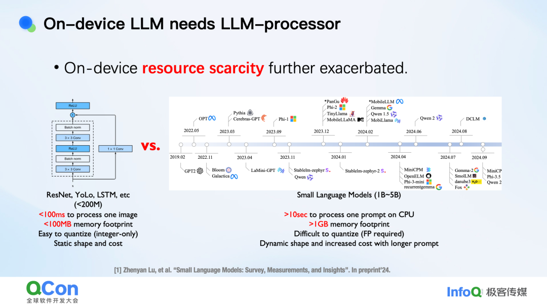 之所以这么说,是因为在大模型出现之前,我们做了很久的端侧 AI 优化,当时一度觉得“没活可干”:像 ResNet-50 这类网络在高通早年的 NPU 上 5 毫秒就能跑完,远远满足需求;ResNet-152 也很快。可大模型一来,学术界突然又有饭吃了。Scaling law 让资源缺口可以无限放大。不是今天把 3B 模型塞进去、明天换成 7B 就完事,而是永远想跑更大的模型:明年 50B,后年 500B,需求没有尽头。