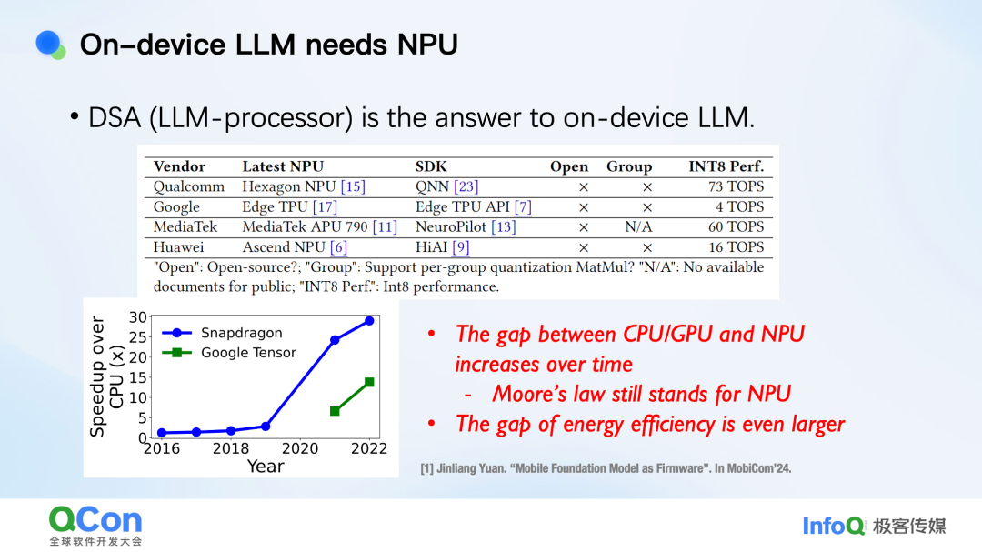 纯技术角度看,国产或各类专用加速器在大模型时代应该更有用武之地。当年 865 那代,我在 Wikipedia 上查到 73 TOPS,肯定不到,因为今年发布的新品才标 80 TOPS。但不管怎样,NPU 靠定制指令和架构级优化,在绝对算力上相对 CPU、GPU 仍有优势,所以我们团队一直坚持做面向 NPU 的框架。蚂蚁那边已经把 CPU、GPU 做到极致,我们就专攻 NPU。选 NPU 还有一个原因:它对系统软件要求更高。硬件算力可以堆得很好看,但上层怎么跟量化算法结合、怎么做 kernel 优化(如果允许写 kernel 的话),能做的事更多,也更难。学术界正好可以往深里钻。