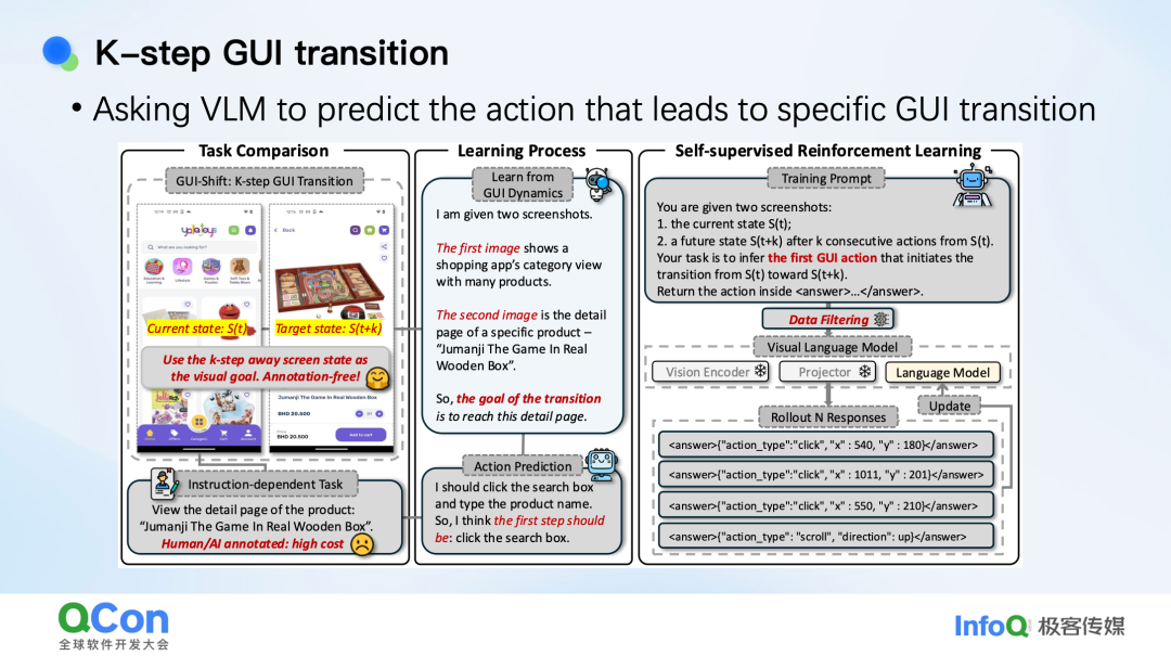 这里说一点我们最近关于训练的想法。训 VLM 理论上需要大量带标注的 GUI 轨迹数据,一连串界面截图和对应的操作。这种数据很难规模化。传统做法像 DeepMind 那样雇几千人、花几千万美元标上百万条轨迹,成本高还容易错。我们就在想,能不能把无标注的轨迹也用起来:不给具体任务,让工具自动在 GUI 里探索。其实很多大厂做 App 测试时就有专门的 GUI Testing 团队,用爬虫把应用界面遍历一遍,收集大量无标注的 GUI 序列。这些数据如果能被有效利用,就能省掉一大笔标注费。