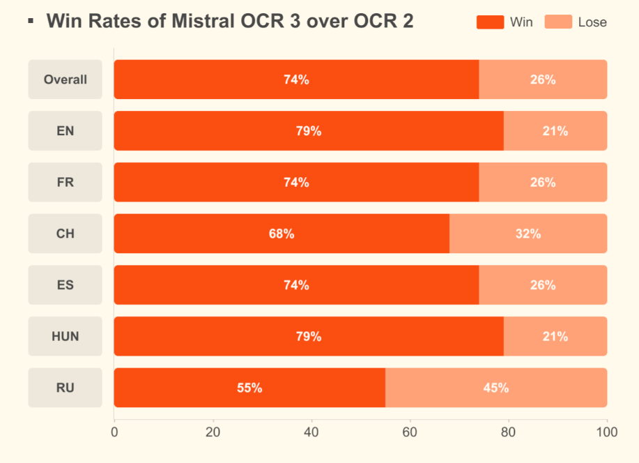 据 Mistral 表示,OCR 3 相较于前一代产品是一次重大的飞跃。在基于真实客户文档工作流的内部评估中,新模型在整体表现上以 74%的胜率超越了 Mistral OCR 2,尤其在表单、手写内容和含大量表格的文档上优势更为显著。这些基准测试采用模糊匹配(fuzzy-match)指标与人工标注的真实结果进行比对,旨在反映实际业务场景,而非理想化的合成数据。