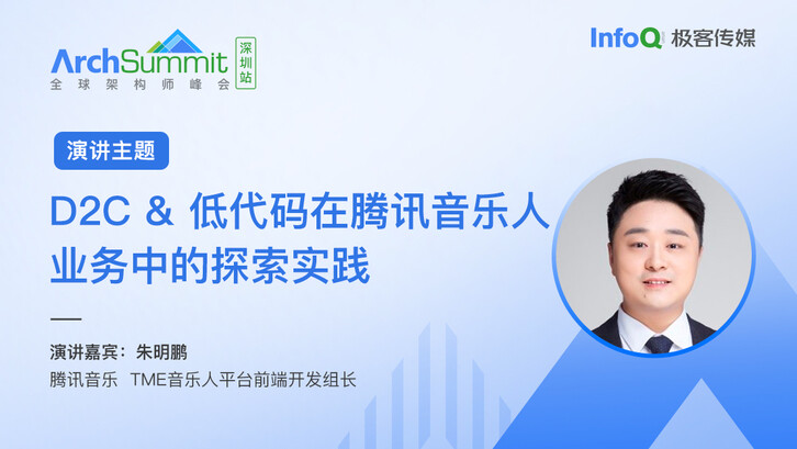 7 月 21 日 - 22 日, 在 ArchSummit 全球架构师峰会(深圳站),腾讯音乐 TME 音乐人平台前端开发组长朱明鹏,将于会上发表题为《D2C & 低代码在腾讯音乐人业务中的探索实践》的演讲,详细介绍 D2C 结合低代码技术在音乐人业务中的研究和实践案例,并与大家分享在这个过程中遇到的难点和解决方案。