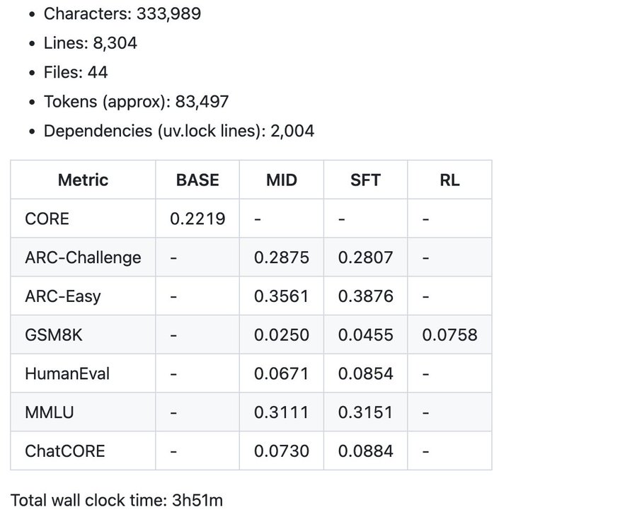 据其透露,目前这个项目绝非最终版本,既未完成全面调优,也未进行性能优化,但它的整体框架已足够完善,可以发布到 GitHub 上,后续所有模块都能在社区中进一步改进。并且,卡帕西称,实际上 nanochat 还有不少容易实现的优化点。
