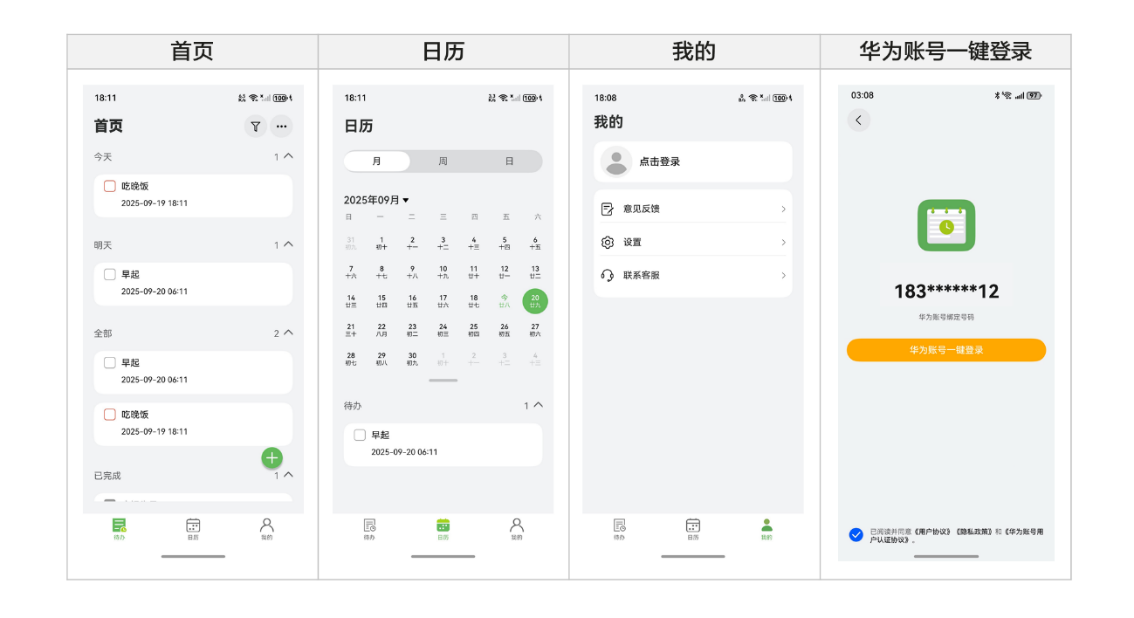 本模板为日程类应用提供了常用功能的开发样例,主要分首页、日历、我的三大模块,模板已集成账号服务,可快速实现华为账号一键登录。