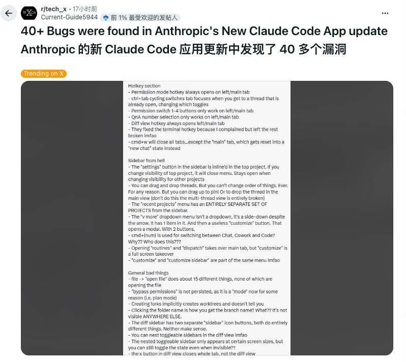 网上很快就有人晒出了一份 bug 清单,里面列了 40 多个问题。更夸张的是,这 40 多个问题,都是 Theo 在一个小时的试用过程中集中撞出来的。