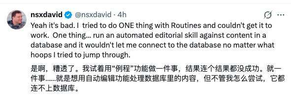 另一个明显问题是,一些原本最该体现效率价值的自动化功能,本身就不太稳定。比如用户想用 Routines 跑一个简单的数据库内容处理流程,结果不管怎么折腾,始终连不上数据库。