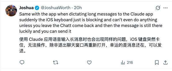 用户提到,iOS 下,键盘会突然卡住。有时连最核心的输入框都会频繁消失,而且几乎每次会话都会遇到,必须退出再重新进入聊天才能恢复。