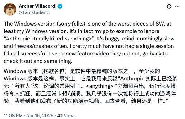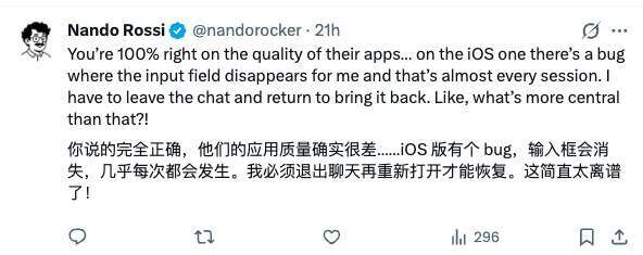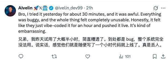 他吐槽说,“我不太相信那些说自己已经用这个应用用了好几周的人,真的认真用过它。我甚至还没开始用它干活、改代码,就已经连续撞上了五六个这样的 bug,感觉自己都快疯了。”