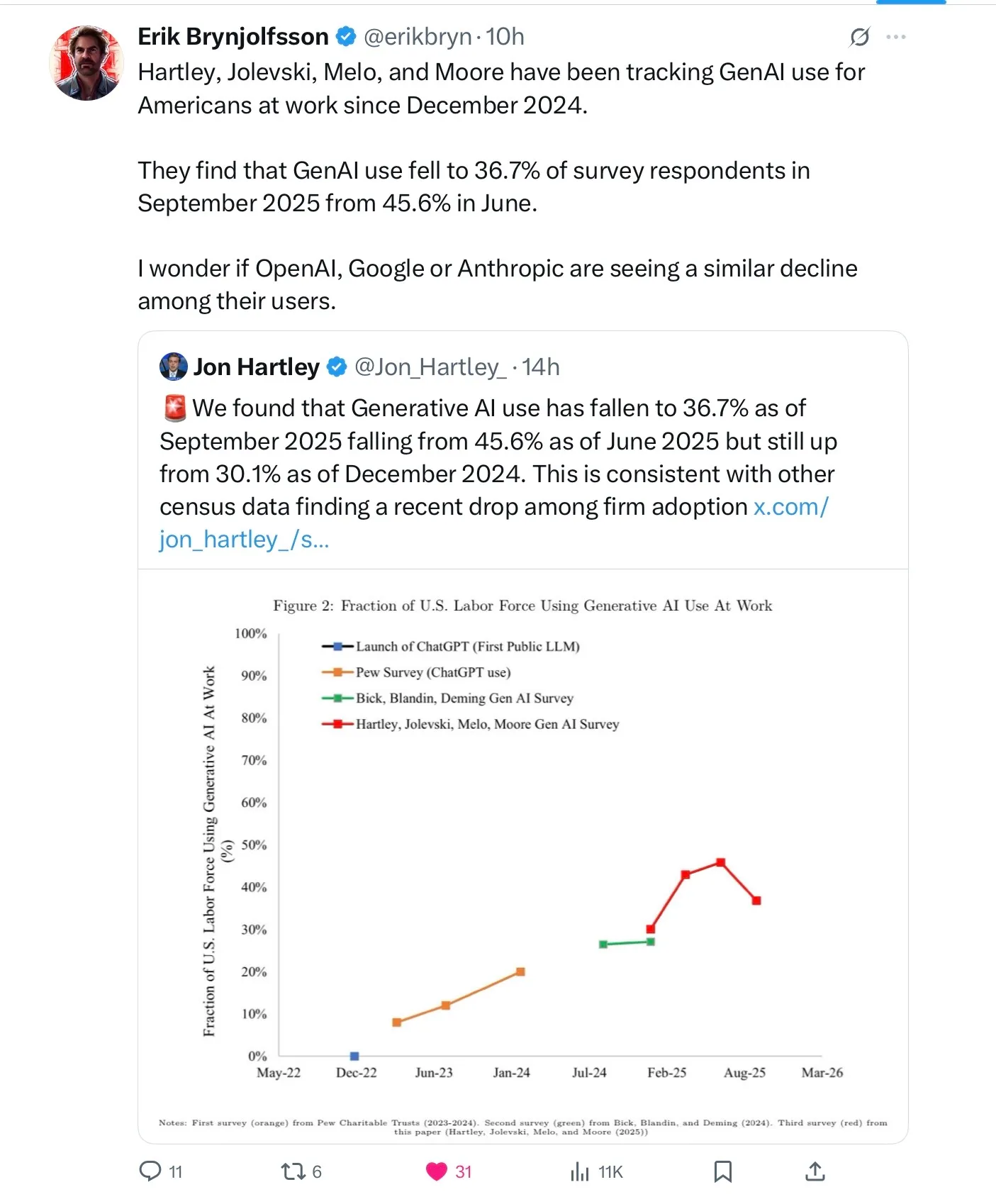 数据显示 GenAI 使用量:2025 年 6 月份为 45.6%,但到 9 月份下降至 36.7%。