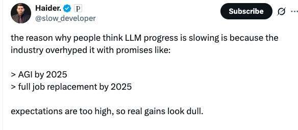 另一种看法认为,错位在于预期过高:两年前“2025 年实现 AGI、全面替岗”的口号把门槛抬得不切实际。