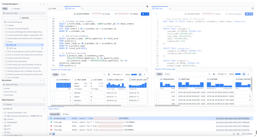编辑器支持选项卡式布局与分割视图,使您能够并排比对代码与执行结果。您可以固定输出内容,在多个选项卡间协同工作,并享受全界面性能提升带来的流畅体验。图表功能与列统计可助您快速理解查询结果,Snowflake Copilot 则能直接在编辑器中生成、修改或解释查询语句。