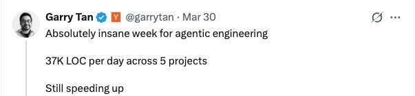 “同时推进 5 个项目,现在平均一天能产出 3.7 万行代码......我最近一直在试着让软件工程师接受一件事:你们一直奉为圭臬的那句‘代码行数没意义’,到了 agentic engineering 时代,可能没那么对了。再过 5 年,你们大概不会相信自己当年真这么想过。”