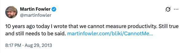 几十年来,怎么衡量开发者的生产力,在软件行业里争议不断。十年前,Martin Fowler 甚至认为,开发者的生产力是无法真正被衡量的。