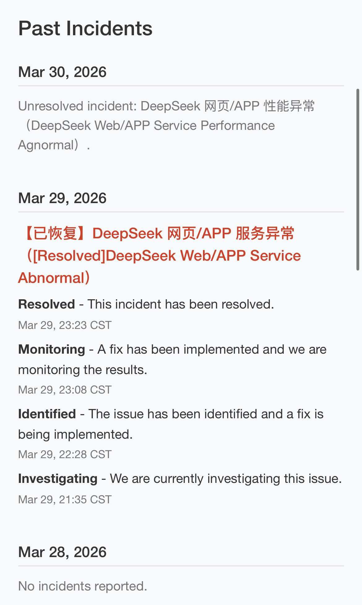 值得注意的是,就在前一天,DeepSeek 刚刚处理完一起类似故障。根据状态页记录,3 月 29 日,DeepSeek 网页及 App 服务曾出现异常,随后官方进行了连续更新,并在 29 日晚 11 点表示已经处理完毕。