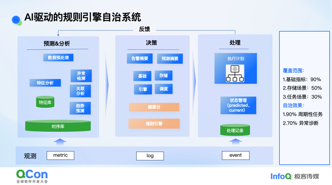 这种基于规则引擎的处理方式具有高效和准确的特点。目前,在我们系统中,基础指标的覆盖率达到 90%,存储场景的覆盖率为 50%,任务场景的覆盖率为 30%。在周期性任务的处理上,我们已经能够覆盖 90% 的场景。在异常诊断方面,我们能够处理 70% 的异常场景,整体数据表现良好。
