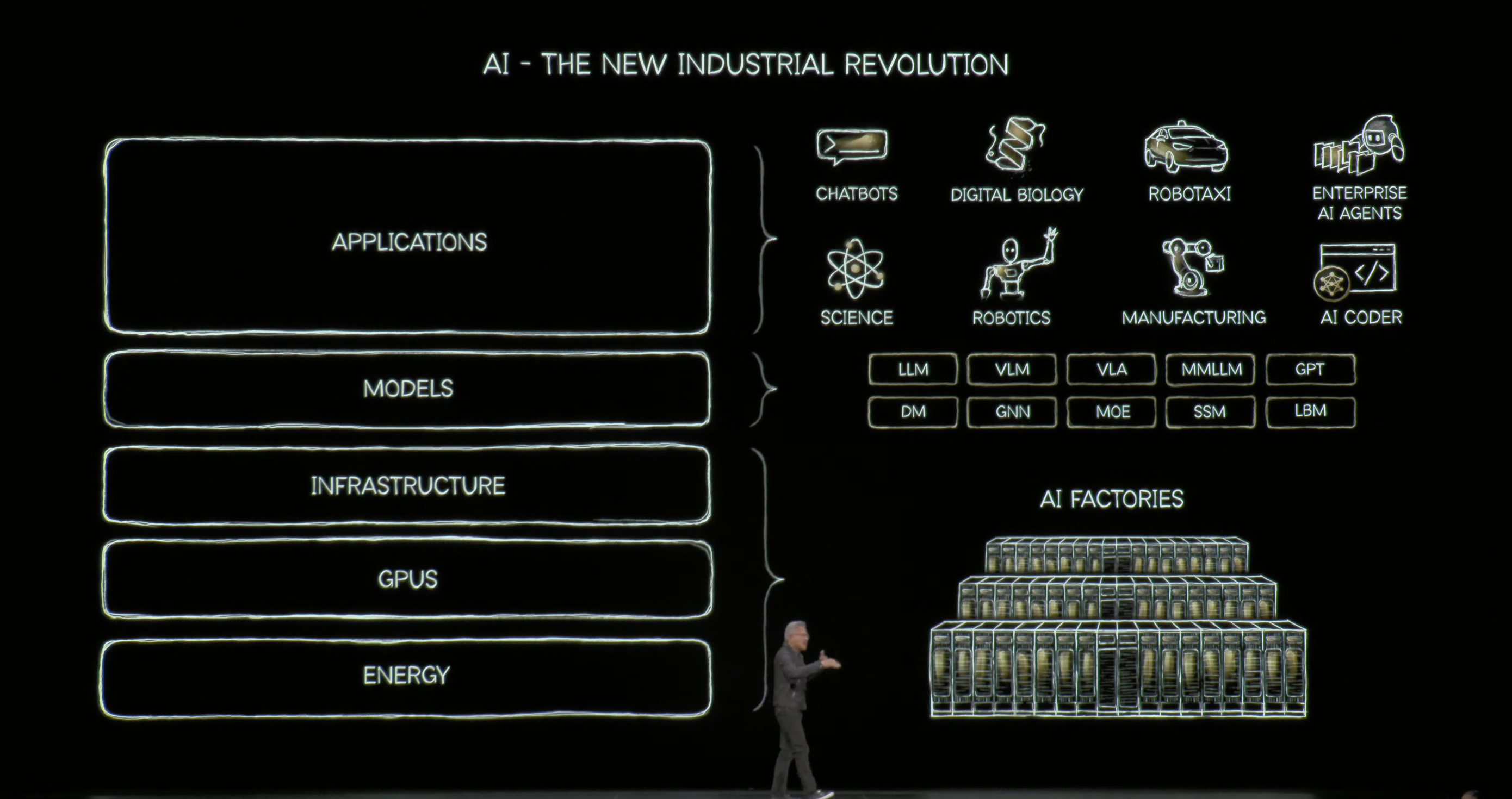 在黄仁勋眼中,它不再是通用数据中心,而是一条智能的生产线——能源是燃料,GPU 是引擎,模型是模具,Token 是产品。