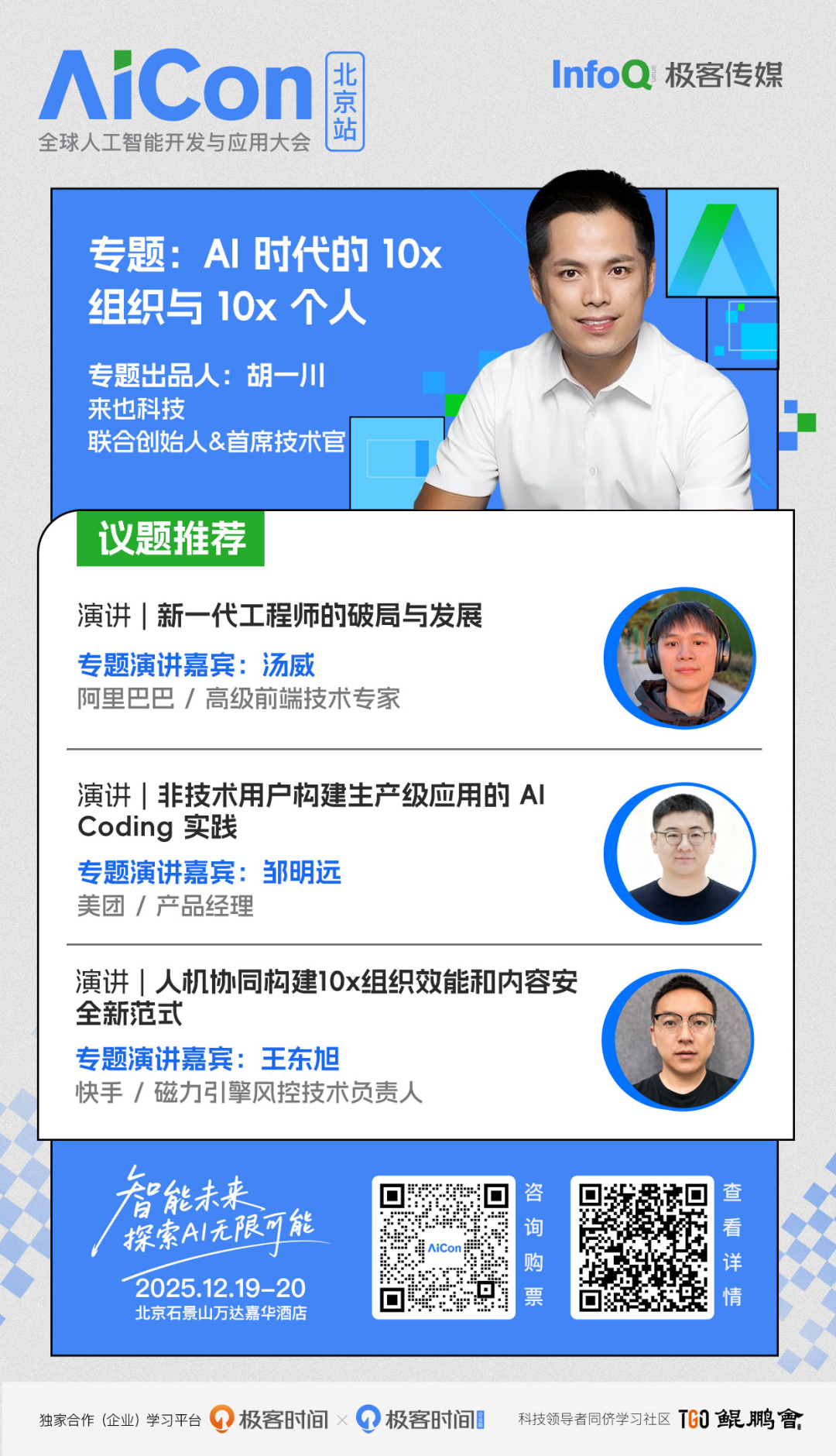 12 月 19~20 日,AICon 全球人工智能开发与应用大会将在北京举办!大会特别策划了《AI 时代的 10x 组织与 10x 个人》专场,由来也科技联合创始人 & 首席技术官胡一川担任出品人,邀请了飞猪高级前端技术专家汤威、美团产品经理邹明远、快手磁力引擎风控技术负责人王东旭等 3 位专家,探讨如何用 AI 构建智能化工作流、激发组织创新力、放大个人影响力。详情可查看点击【阅读原文】查看大会官网。