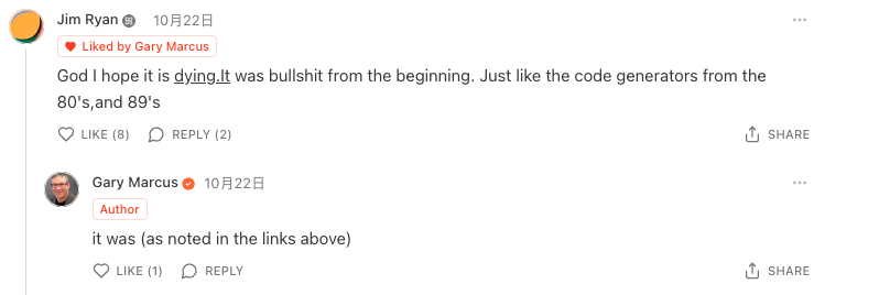 就在流量持续下滑的背景下,社交媒体上对 Vibe Coding 的厌倦与反感也在迅速累积。Gary Marcus等学者和评论者近期对 Vibe Coding 编程抛出了极端批评,Gary Marcus甚至点了赞支持那条“真希望它赶紧消亡,它从一开始就是扯淡”的评论。这样的情绪在最近几个月里反复出现——在各种技术讨论中,都能感受到从从业者到普通用户,对“氛围编程”的耐心正在迅速消失。