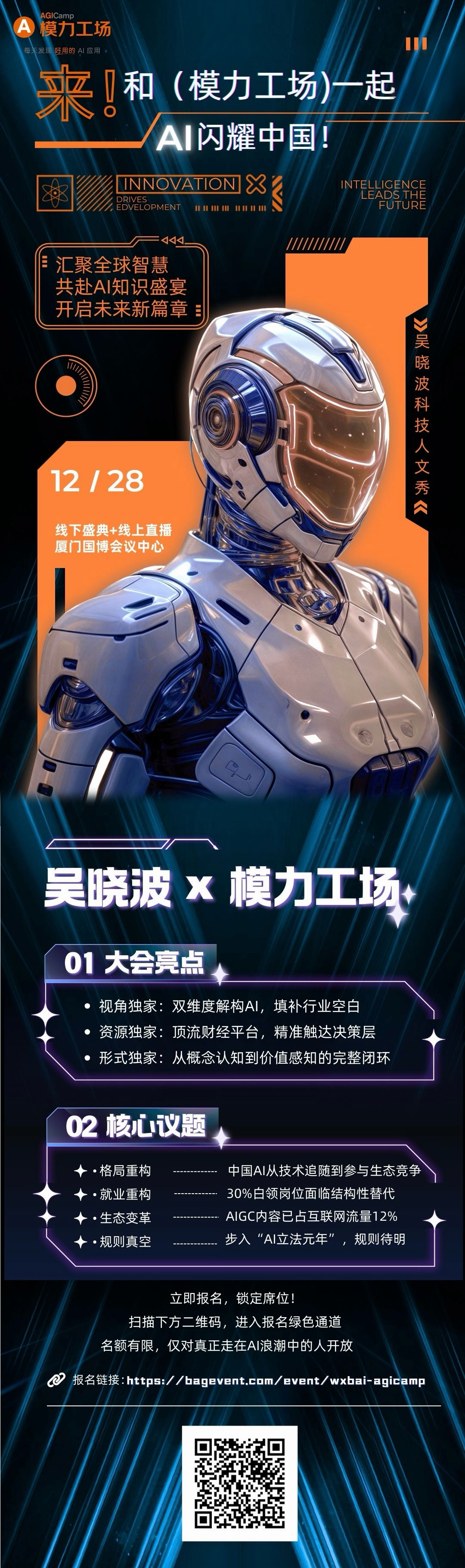 本次活动将突破惯有范式,以“经济学+人文”双重视角解读 AI 未来。知名财经作家吴晓波先生将担纲主讲,与 5000 余名产业决策者、技术领军者及投资人共聚一堂,围绕技术疾驰背后的四大核心命题——“格局重构、就业重构、生态变革、规则真空”,展开深度思辨。现场更将融合科技艺术大秀、产品体验与多模态交互,打造沉浸之旅,让您不仅听见趋势,更亲身触摸未来。