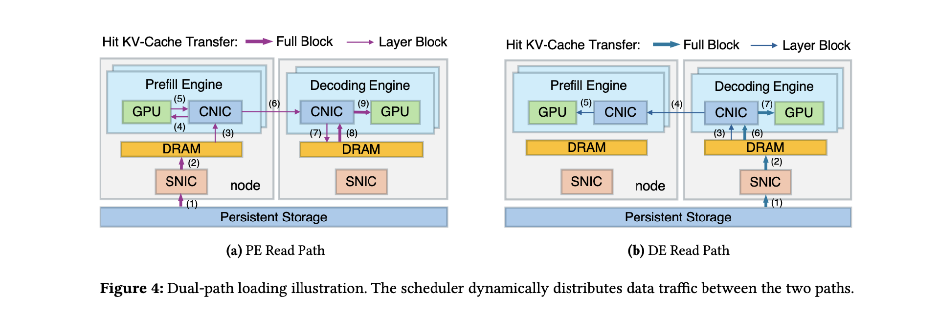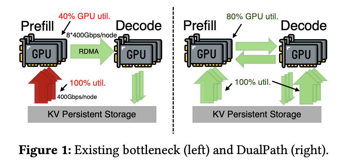 这恰好与 DeepSeek 在论文中提出的 DualPath 架构形成呼应。DualPath 的核心思路是增加一条“存储—解码—预填充”的加载路径,使 KV-Cache 可以先加载到解码节点,再通过 RDMA 网络转发至预填充节点,从而将存储带宽压力在多个节点间重新分配。