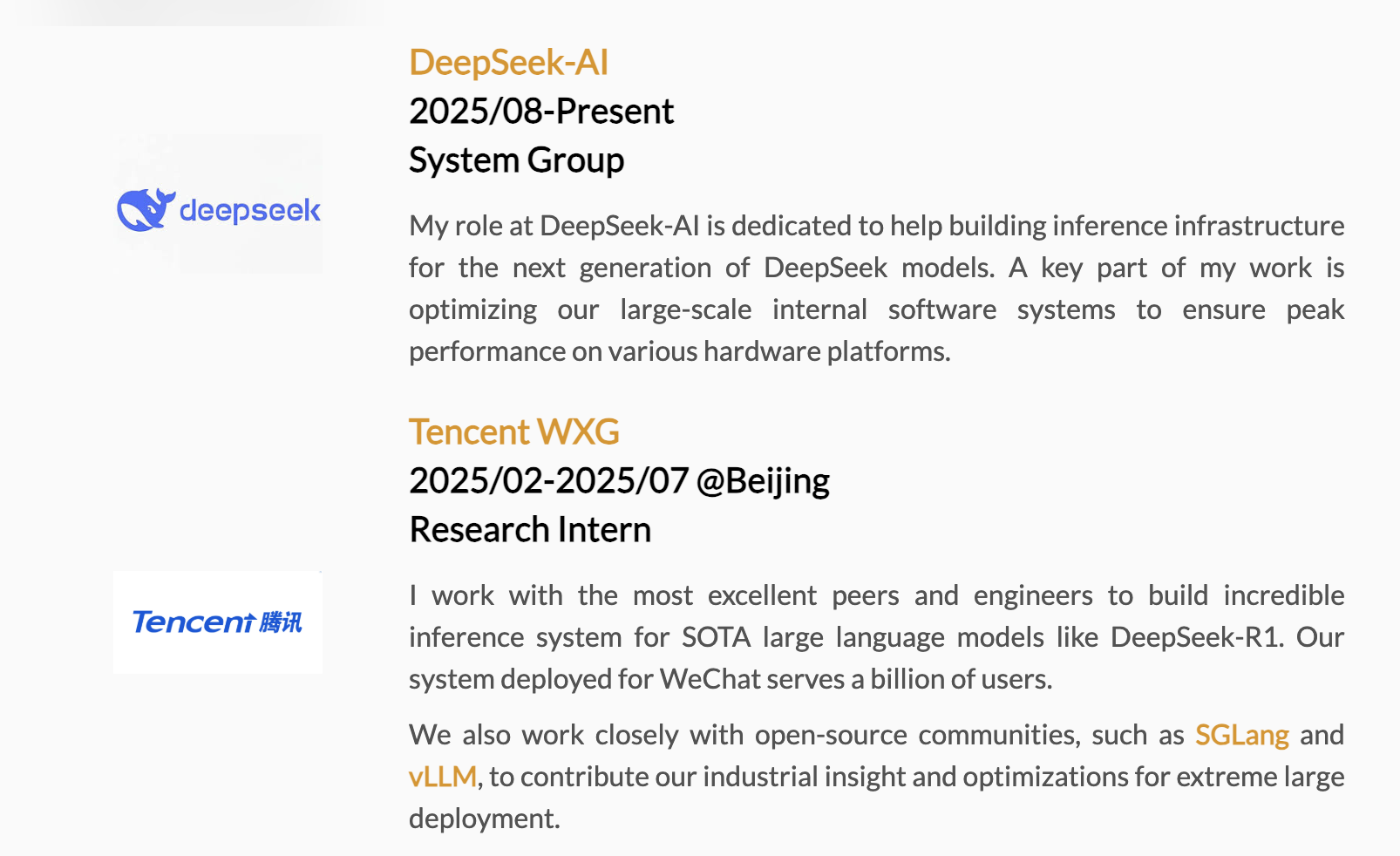 2025 年 7 月,吴永彤加入 DeepSeek 系统组,参与下一代模型推理基础设施的建设工作。他的核心职责之一,是对大规模内部软件系统进行系统级优化,使其能够在不同硬件平台上实现高效、稳定的运行。这类工作本质上属于大模型基础设施(Infra)建设范畴,重点在于提升推理系统在复杂集群环境中的性能与资源利用效率。