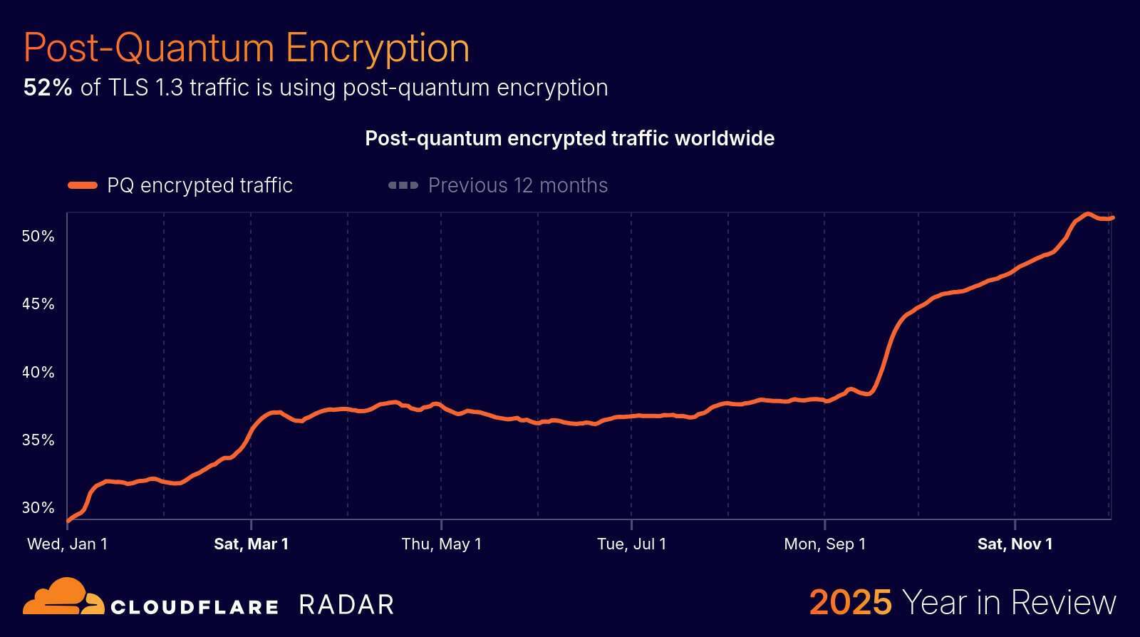 尽管 2025 年 HTTP/3 和 HTTP/2 请求量均小幅增长,但在人类产生的 Web 流量中,为了有效防范“先收集、后解密”的攻击手段,已有半数采用后量子加密技术——该比例较年初的 29%几乎翻倍。