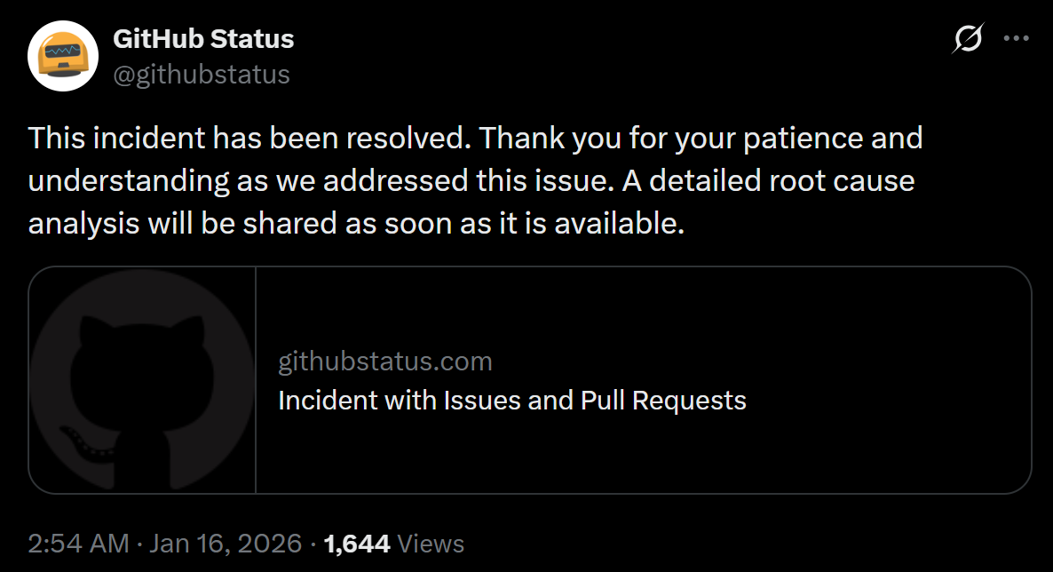 而 GitHub 也在解决问题后在 X 上作出回应,“本次故障已完全解决。感谢各位在问题处理期间的耐心与理解。故障根本原因的详细分析报告,将在完成后第一时间对外公布。”