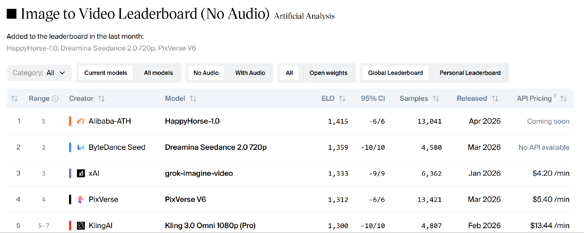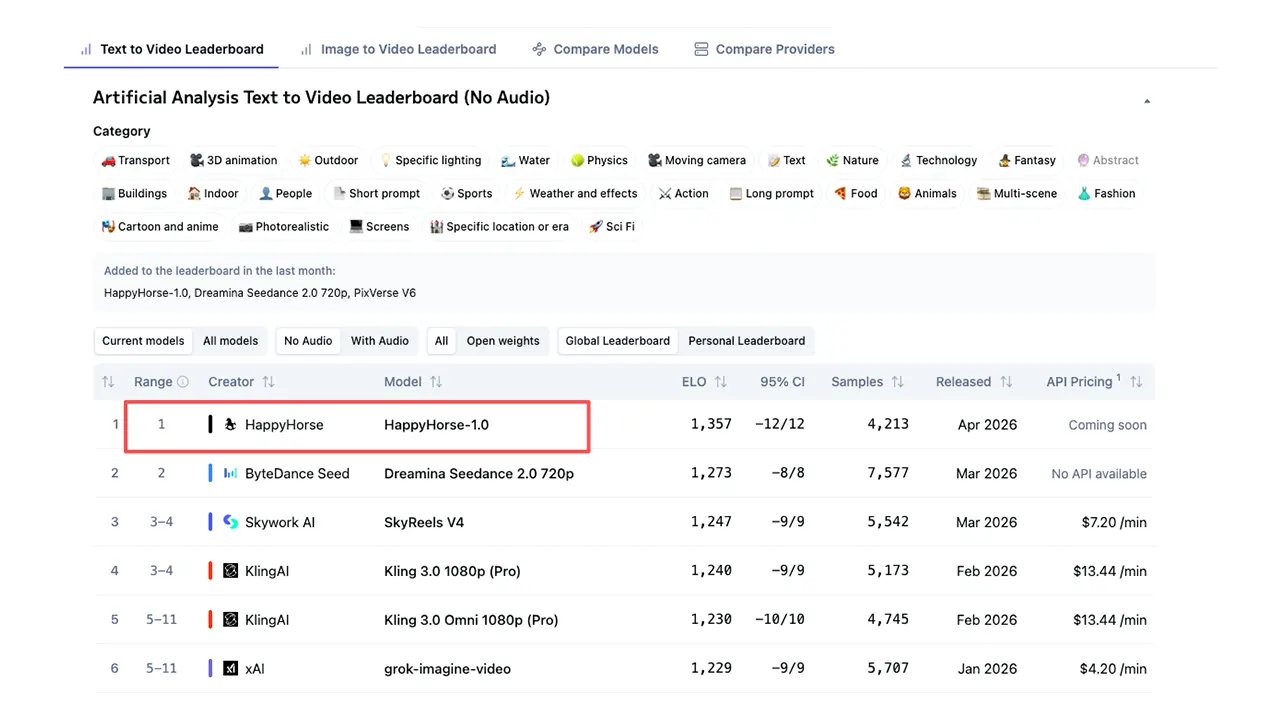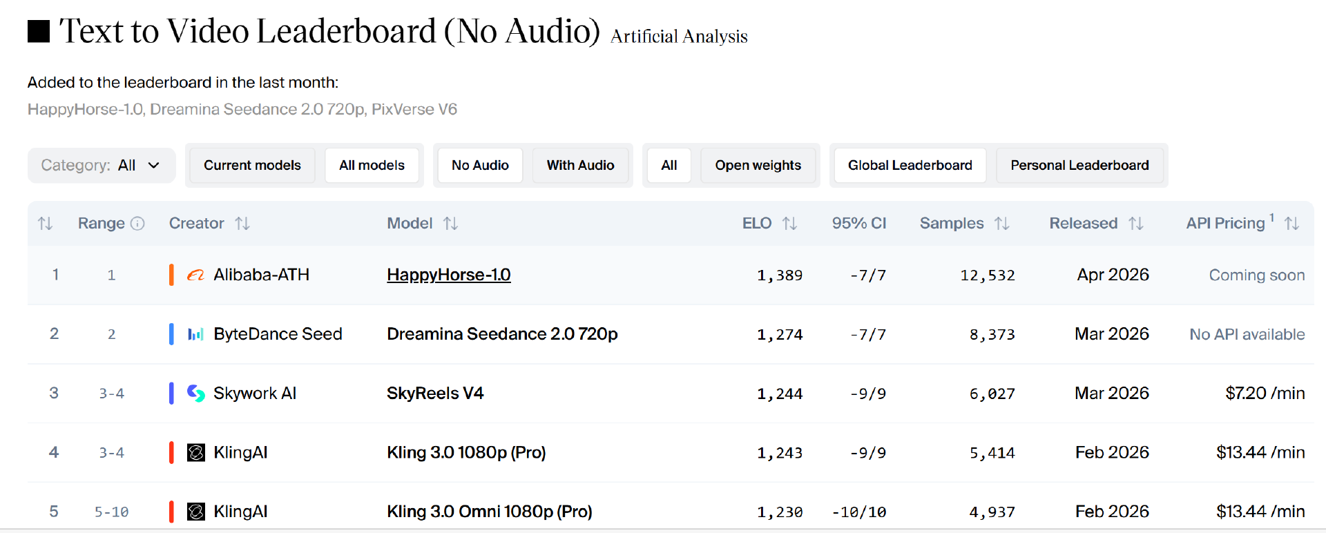 不过,有一点需要提醒:新模型的 Elo 分数波动通常更大。这些分数后续还会变动,具体走向尚无法确定。HappyHorse 1.0 正式开放后,样本数量还会增多。