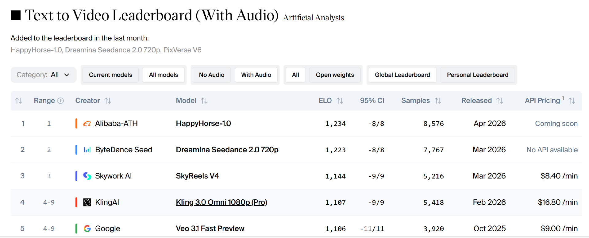 Artificial Analysis 稍后也在 X 平台发布信息称,HappyHorse-1.0 由阿里巴巴支持四种视频生成模式:文本转视频和图像到视频,均支持原生音频和不带原生音频,API 访问计划于 4 月 30 日上线。