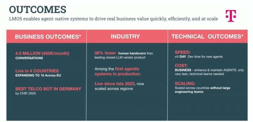 这些平台已支撑德国电信的多项 AI 应用,其中包括多次获奖的客服机器人 Frag Magenta。到 2023 年底,首个代理在德国电信投入生产,并在欧洲加速扩展:覆盖范围从 3–4 个国家增至 10 个国家,上线后月均处理约 450 万次会话;到 2024 年,转人工次数下降 38%。于是这成为欧洲最大规模之一的、真正投入生产的 Agentic 系统。