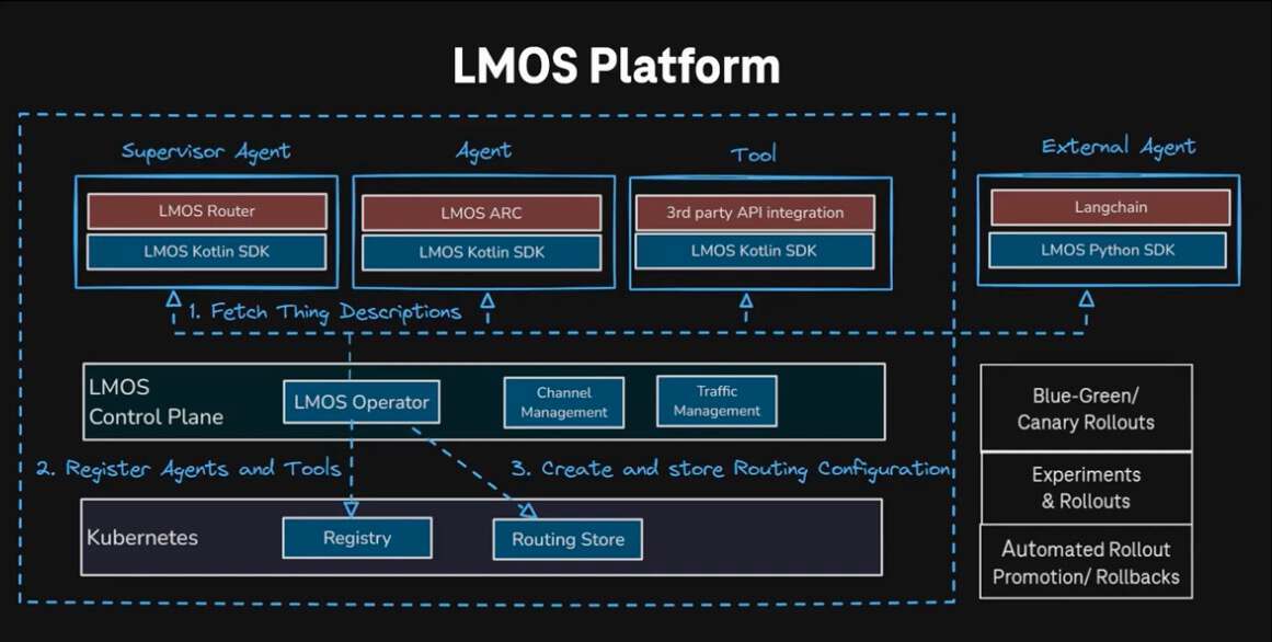 LMOS 平台层:开放的云原生编排层,用于代理生命周期管理、发现、语义路由和可观测性。它基于云原生计算基金会(CNCF)技术栈构建,目前处于 alpha 版本。
