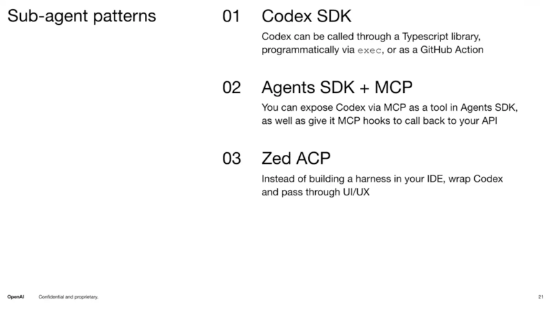 我们的顶级合作伙伴,如 GitHub,已经利用这些模式取得了巨大成功。我们为 GitHub 创建了一个 SDK,允许他们直接与 Codex 集成。你也可以使用这个 SDK 将 Codex 作为你 CI/CD 管道的一部分,或者将它作为与自己 Agent 直接互动的工具。如果你想定制 Agent 层,完全可以这么做。举个例子,我们与 Cursor 团队紧密合作,他们将自己的 Harness 与我们开源的 Codex CLI 实现对接,成功地优化了系统性能,所有这些都是公开可用的,你可以克隆我们的代码库,随意使用。