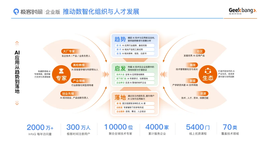 极客时间企业版是极客邦科技打造的企业级 AI 与数智化人才赋能平台。我们致力于通过“体系化课程+智能化平台+场景化服务”的一体化交付模式,为企业构建面向 AGI 时代的实战型人才体系。