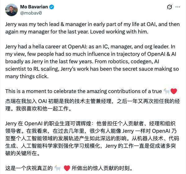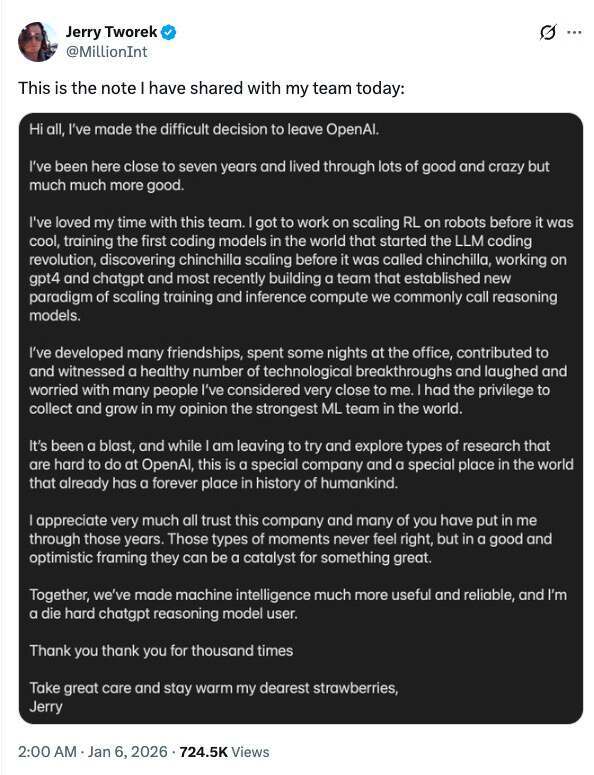 2026 年的第一个月,Jerry Tworek 离开 OpenAI 的消息传出来时,几位 OpenAI 的员工都觉得很突然,他们在 X 上评论说:“我真的崩溃了”“这太难受了”。