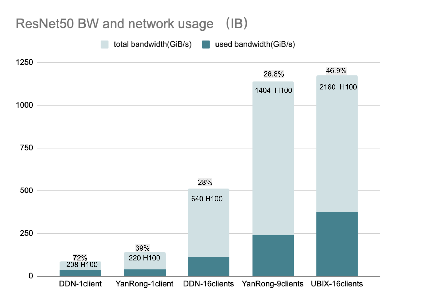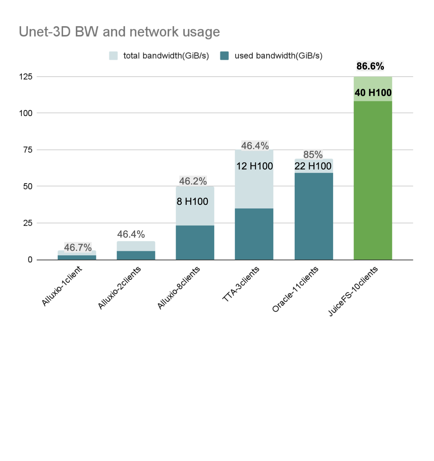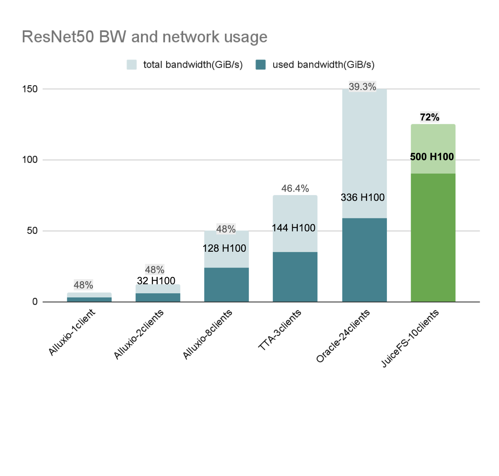 在该测试中,JuiceFS 在同类系统中支撑了最多数量的 500 张 H100 GPU,并在所有基于以太网的方案里实现了最高的网络带宽利用率,达到 72%,其余产品在此次测试中的带宽利用率大约在 40% 的水平。