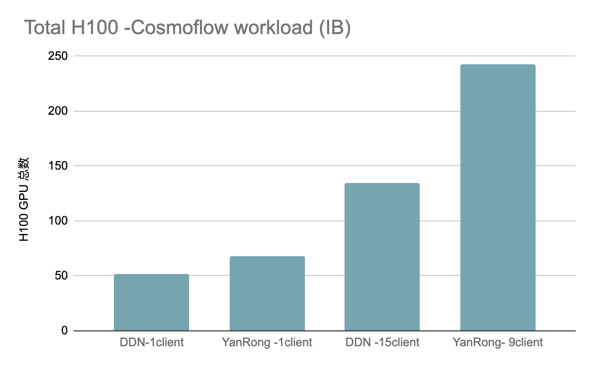 CosmoFlow 训练负载需要读取海量小文件,这对存储系统的元数据性能和读延迟性能提出了极高要求,同时测试规定 GPU 利用率需达到 70% 以上。由于任务对延迟要求非常高,随着 H100 数量的增加,多节点分布式训练的读取延迟方差会显著增加,从而使得 GPU 利用率快速下降,导致水平扩展十分困难。与 3D U-Net 相比,CosmoFlow 的提交结果总数明显更少,这也反映了该负载优化难度较大。