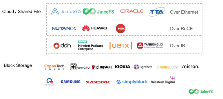多个类别的存储系统参与了本次 MLPerf Storage v2.0 测试。与 InfiniBand 系统相比,基于以太网的存储方案通常在灵活性和成本效益方面具有优势,能够在不依赖昂贵专有硬件的前提下,仍然提供出色的性能。以太网方案在大规模 AI 训练中已经得到了广泛应用,成为许多用户选择的经济且可扩展的解决方案之一。