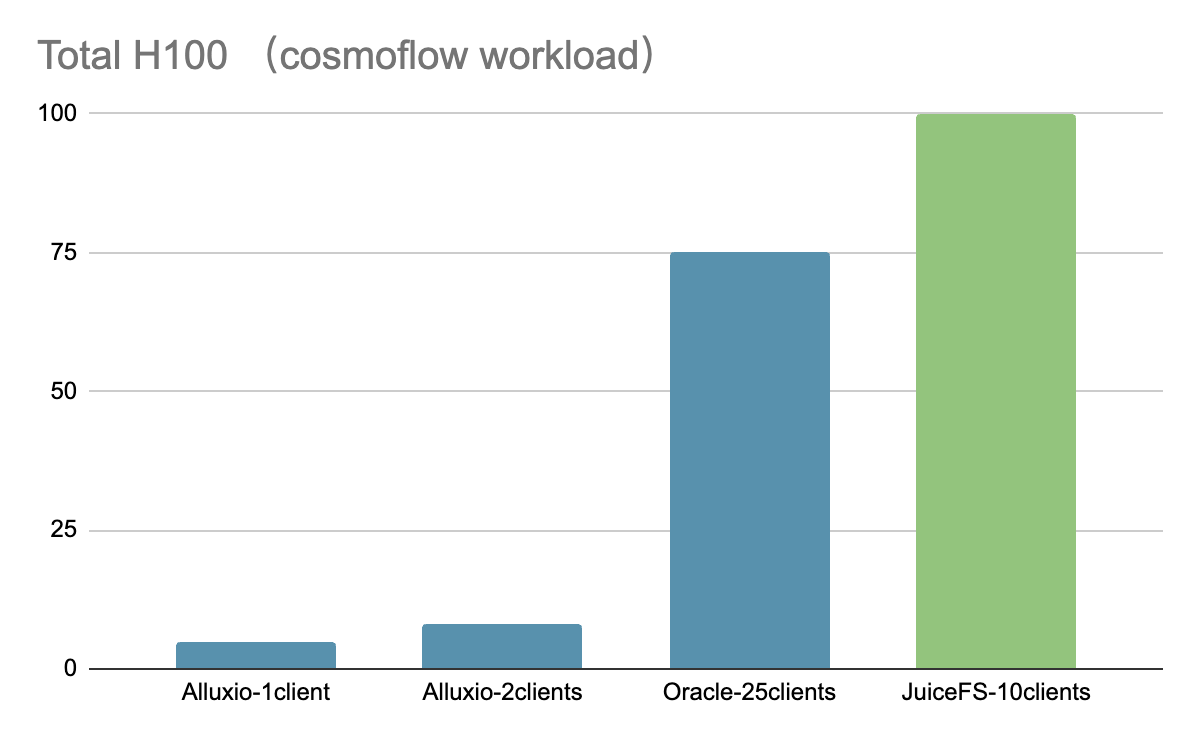 下图横轴表示系统能够支撑的 GPU 总数,即 H100 GPU 的数量,JuiceFS 和 Oracle 的表现继续领先。JuiceFS 通过 10 个客户端同时运行,支撑了 100 张 H100 GPU 的 Cosmoflow 训练任务。