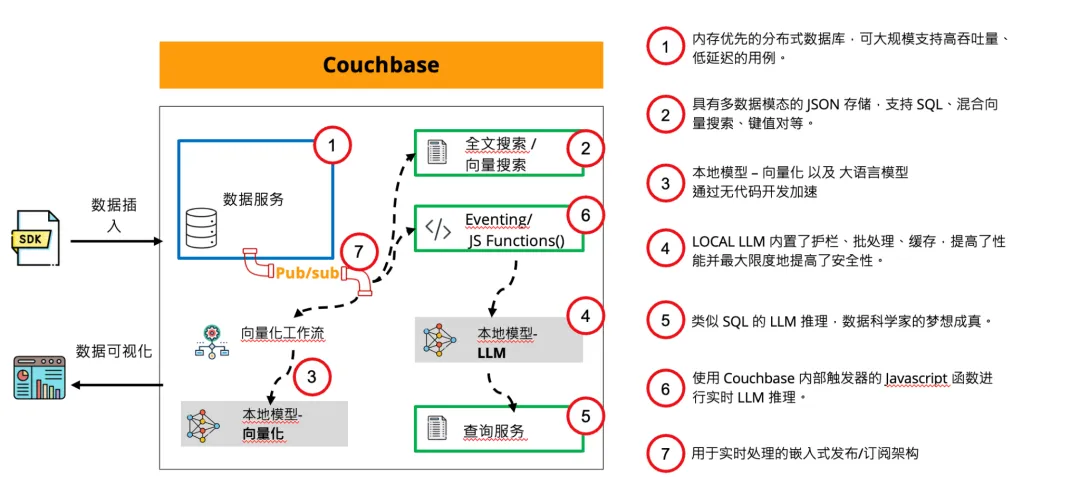 多模型数据服务:开发者可在同一平台上使用键值 (Key-Value)、文档 (JSON)、SQL++ 查询、全文检索、向量搜索等多种数据访问方式,极大简化技术栈。