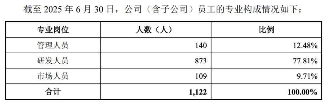 这种高投入也体现在团队结构上。截至 2025 年 6 月 30 日,摩尔线程共有员工 1122 人,其中研发人员达到 873 人,占比 77.81%。