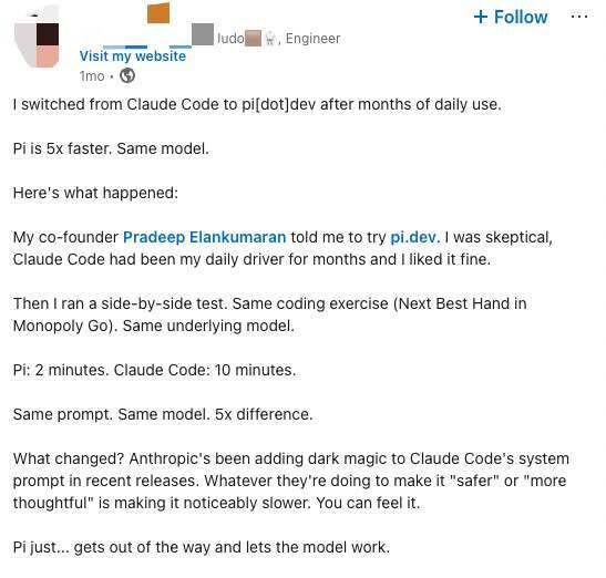 网友评价:同一个编程任务,同一个模型。Pi:2 分钟,Claude Code:10 分钟