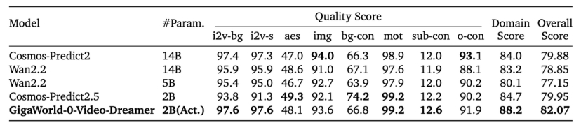 在 PBench ( Robot Set )基准上, GigaWorld-0 与当前先进的世界模型进行全面对比,为所有对比模型中参数量最小,整体性能最高的世界模型。 这一结果证明 GigaWorld-0 在具身智能任务中兼具卓越的生成质量与极致的推理效率,是目前最具性价比的世界模型方案。