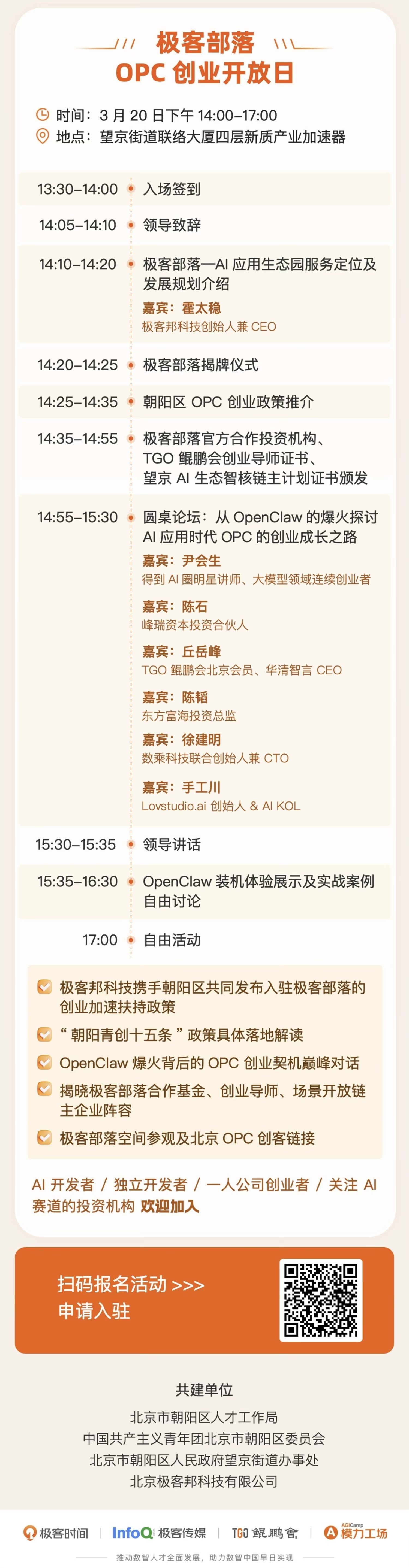 3 月 20 日下午 14:00-17:00,在望京街道联络大厦四层新质产业加速器,极客部落将举办揭牌仪式,届时将: