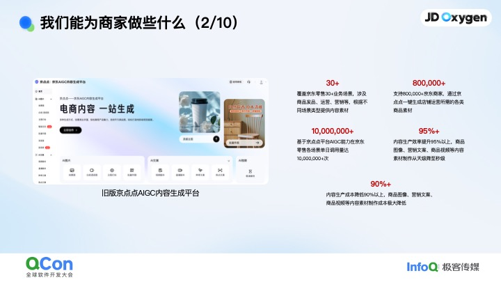 针对这些痛点问题,过去一段时间我们通过京点点 AIGC 内容生成平台服务了京东零售超过 30 个业务场景,支持了 80 万以上的京东商家,每天京点点平台的 AIGC 能力调用量达 1000 万以上,内容生产效率提升了 95% 以上,同时也带来了生产成本上的大幅优化。