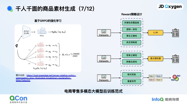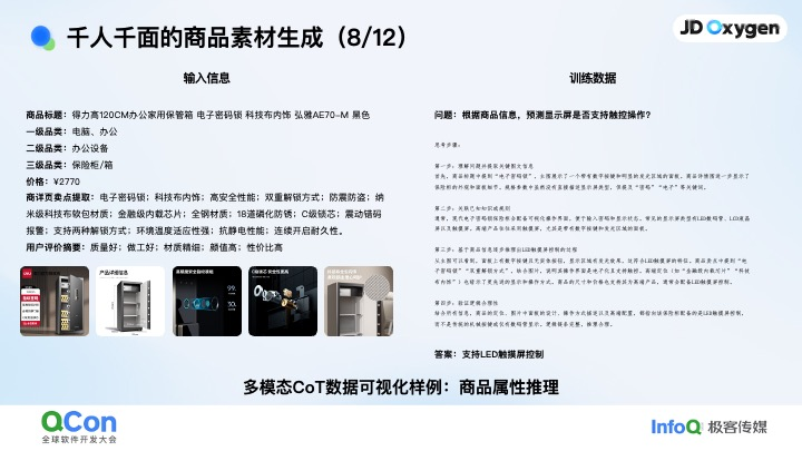 这页幻灯片我们给出了一个真实的用于电商零售多模态大模型后训练的 CoT 训练样本,输入是包括商品标题、类目、价格、商详、用户评价以及商品主图在内的商品多模态信息,CoT 部分则是一个四步思考的推理链条,大家感兴趣的可以详细阅读。