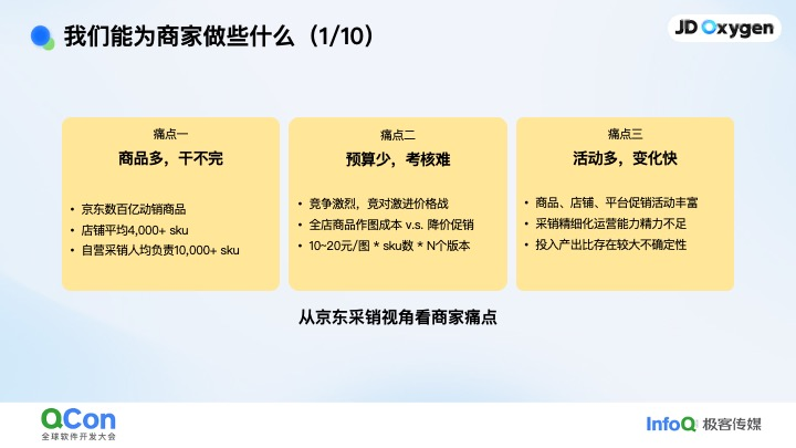 首先,我们从京东采销的视角来看看商家有着什么样的痛点。第一,商品多,活干不完,大家知道在京东我们有数百亿的动销商品,店铺平均 sku 达 4000 以上,以自营采销为例,平均每人要处理上万的 sku。第二,预算少,考核难,大家知道各个电商平台都在激进的进行价格战,在这个大背景下,全店铺商品的素材制作成本也是一笔不容忽视的成本开销。第三,活动多,变化快,商品、店铺、平台促销活动非常丰富,而采销精细化运营的能力其实是参差不齐的,且精力不足,因此在每个活动上的投入产出比具有非常大的不确定性。