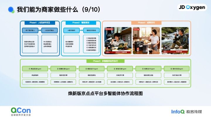 这张幻灯片展示了焕新版京点点平台的业务逻辑流转图,第一阶段是人机交互,这一阶段里用户将自己的需求描述给机器,机器来确认商品的相关信息是否完备,用户需求是否明确;第二阶段是非常经典的任务规划阶段,大模型在这个阶段要完成任务的拆解与规划,比如模型认为一个主图生产任务可以被分成 6 项工作,商品信息采集、智能抠图处理、模版风格匹配、文案内容生成、场景图像合成以及最终效果整合。所以,第三阶段的多智能体协作执行,在这个案例下就是有六个独立的智能体在串行执行。右上方是整个链路输出的实际素材效果。那我们整个焕新版京点点平台的技术框架就介绍到这里。